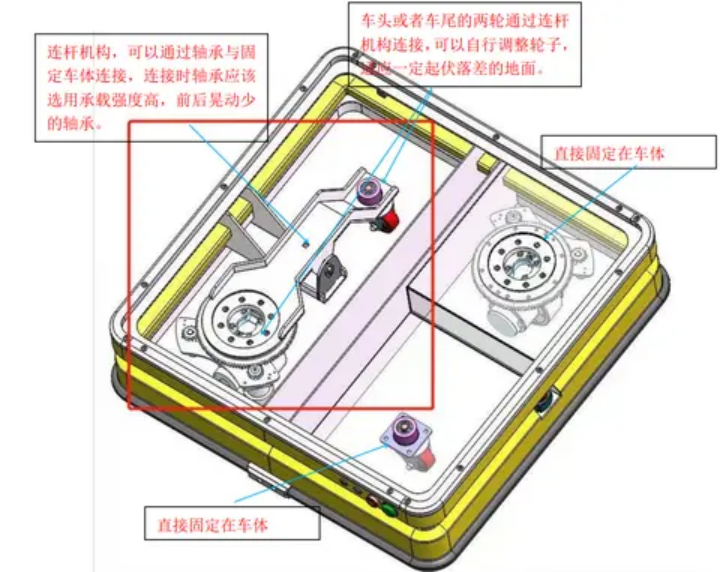 (4) 缺點:舵輪上下浮動時,舵輪沿鉸鏈為圓心旋轉,舵輪觸地點相對安裝垂直中心偏移,布局位置微變,影響控制計算。車體本體需要較大配重,以便空載時將減震彈簧壓制至適合位置,萬向輪輕微觸地。壓力浮動變化較大,在舵輪下沉時,壓力損失較大,容易導致舵輪摩擦力急劇減少,導致舵輪打滑。鉸鏈受側向力時,容易變形,導致晃動加劇,尤其是 AGV 平移時。